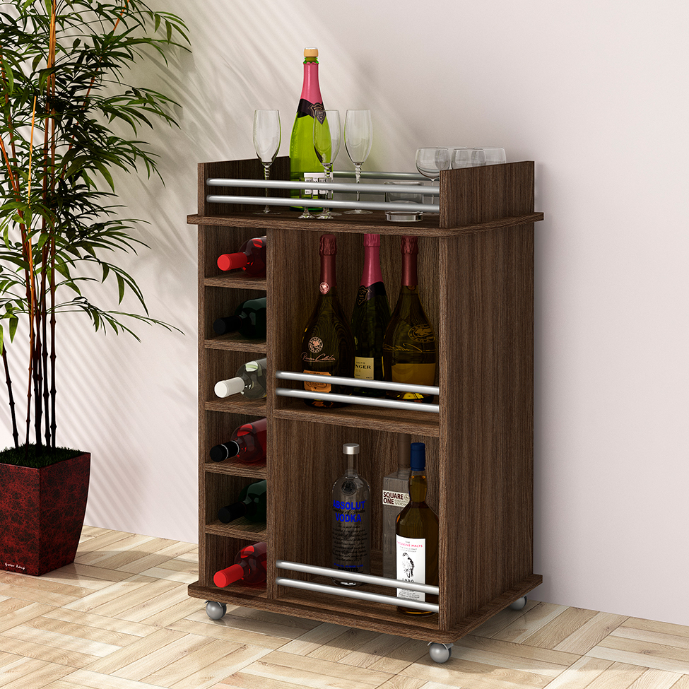 Quem gosta de confraternizar sabe o quanto é importante poder contar com móveis que facilitem o bem-estar dos convidados e garantam um funcionamento fluido do evento. A Adega Algarves é perfeita pois vem equipada com dois nichos onde você pode apoiar copos, taças, coqueteleiras e outros utensílios para ajudar no preparo das bebidas, além de 6 compartimentos para garrafas e um tampo para os itens que você quer deixar de fácil alcance. De quebra, as barras verticais evitam que os objetos tombem durante a movimentação, que fica muito mais prática graças aos rodízios - desse jeito, você pode levá-la para onde está a festa! Para completar, a estrutura compacta e a cor marrom são simples de inserir no ambiente e fazem dessa peça a opção ideal para quem quer dividir bons momentos com pessoas especiais sem deixar de lado o bom gosto.
