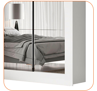 O Guarda-Roupa Luiza é composto por Estrutura em MDP 12 mm e Espelho 3 mm. Possui Cabideiros em Alumínio, Corrediças Metálicas e Acabamento Fosco.