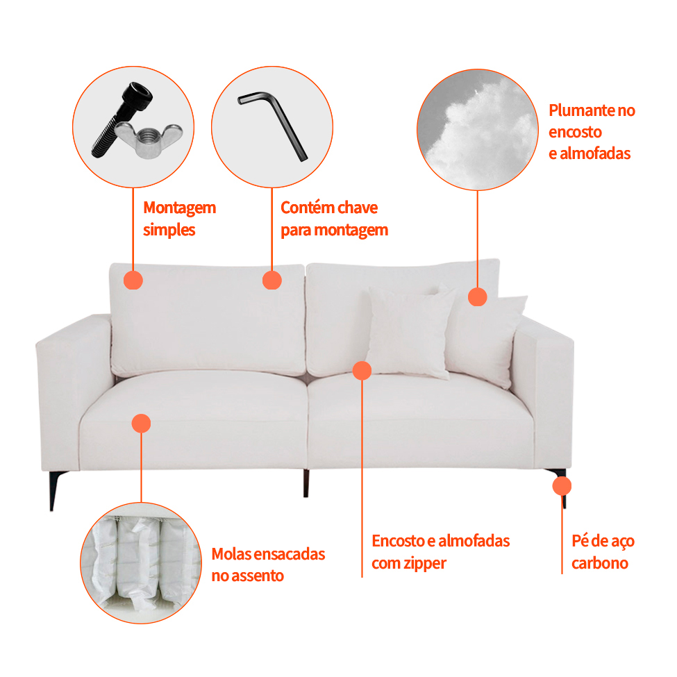 O tamanho de 170 centímetros é ótimo para aconchegar a família, ainda mais porque ele conta com assento reforçado por molas e percintas elásticas, enquanto o encosto é preenchido com manta siliconada, que proporciona a comodidade ideal. Já o bouclé na cor off white garante o acabamento perfeito para um sofá moderno e de muito bom gosto. Para complementar o bem estar, o sofá acompanha o Puff Unne, que combina estrutura de madeira maciça, espuma com densidade incrível e visual sofisticado para potencializar os momentos relax e a decoração da casa.
